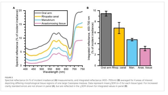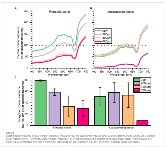 光微環境異質性:水母不同解剖結構(如口腕、柄部)的光子標量輻照度存在空間差異(圖1),白色色素組織(尤其鐘形體)通過光散射增強光滲透(圖2-3)。