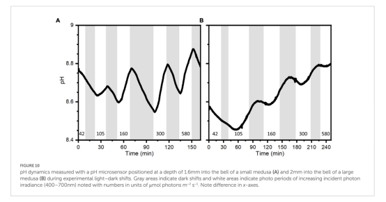 數據:黑暗時表層pH驟降(較海水低0.3-0.5單位),但深層(>1000μm)維持pH~8.8;大型水母pH變化延遲>10分鐘。