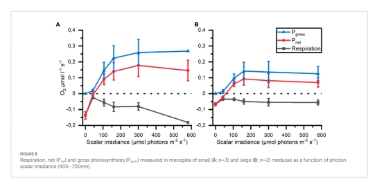 數據:小型水母O?濃度光暗響應迅速(分鐘級);大型水母光照停止后O?仍持續上升數分鐘。