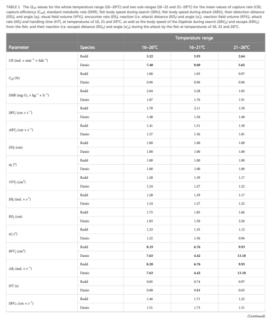 獵物逃避能力受限:水蚤的逃避速度(EBV)和反應距離(RDD)對溫度不敏感(Q??≈1),導致魚類攻擊成功率大幅提升(表1)。
