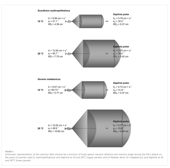 對象:紅眼魚(溫帶種)和馬拉巴斑馬魚(熱帶種)幼魚,獵物為水蚤。