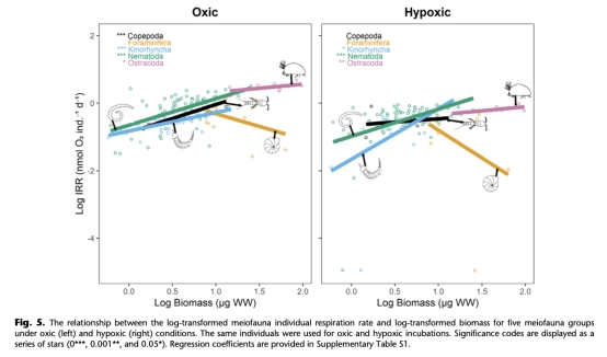 呼吸速率與生物量的異速生長關系:五大主要類群(線蟲、動吻動物、有孔蟲、橈足類、介形蟲)在常氧和低氧條件下,對數轉換后的個體呼吸速率(log10 IRR)與對數轉換后的生物量(log10 Biomass)之間的回歸關系(包括回歸系數a和b及其顯著性)。(數據展示和回歸線來自圖5)。