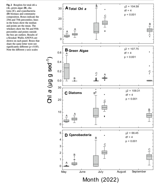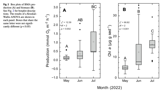 數(shù)據(jù):攝食球與未攝食沉積物的葉綠素a無(wú)差異(p=0.15),但不同月份生物量差異顯著(p<0.001)。