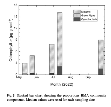 BMA動(dòng)態(tài):BMA生物量(葉綠素a)在6-7月達(dá)峰值(16 μg chl a g?1沉積物),群落以底棲硅藻為主(>80%),藍(lán)藻次之(圖2, 圖3)。