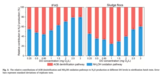 在DO=0.25-3 mg/L范圍內,IFAS系統的N2O排放因子(EF)比純懸浮污泥系統低50-83%。