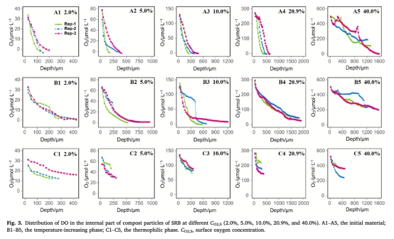 揭示堆肥進程(升溫期→高溫期)中DO擴散深度從1320 μm降至392 μm(SRB),闡明微生物耗氧加劇導(dǎo)致厭氧層擴大的機制。