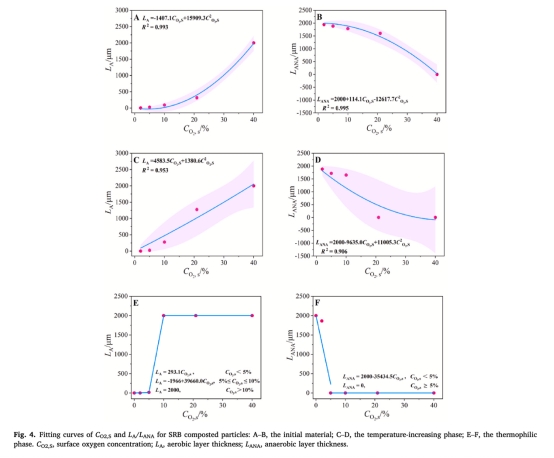 溶解氧分布:Unisense微電極(OX-25)測量顯示,堆肥顆粒內(nèi)部DO擴散深度隨堆肥進程和堆高增加而減小,厭氧層厚度(L_{ANA})增加(圖3)。建立C_{O2,S}(表面氧濃度)與L_A/L_{ANA}的擬合方程(圖4),預(yù)測閾值氧濃度(C_{O2,SA}/C_{O2,SANA})。