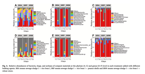 四組處理:污泥+稻殼(SRA)、污泥+稻殼+花生殼(SRP)、污泥+稻殼+小麥秸稈(SRW)、污泥+稻殼(SRB對照)。