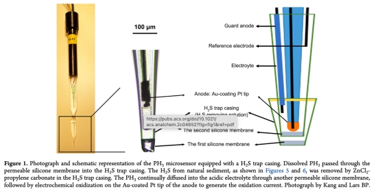 研究開發了一種高選擇性電流型磷化氫(PH?)微傳感器,用于原位監測水體和沉積物中的痕量PH?(檢測限2 nmol·L?1)。傳感器采用金鍍鉑(Au-Pt)工作電極和前置H?S捕獲裝置(ZnCl?-碳酸丙烯酯),通過雙層硅膜實現氣體選擇性滲透。PH?在酸性電解液中被電化學氧化為H?PO?,產生的電流與PH?濃度線性相關(0–1200 nmol·L?1)。該傳感器成功應用于海洋沉積物剖面,在13 mm深度處檢測到PH?富集(100 μmol·L?1)。