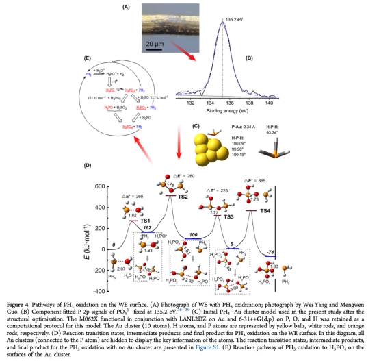PH?在Au表面經H?PO中間體分步氧化為H?PO?,量子計算證實能壘降低(265→225 kJ·mol?1)。