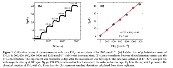 數據:0–1200 nmol·L?1 PH?范圍內電流響應線性(R2=0.996),靈敏度0.037 pA/nmol·L?1。