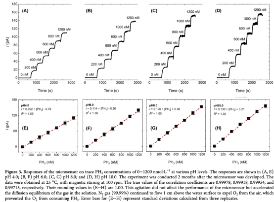 pA級電流分辨率(圖2A)實現nmol·L?1級PH?定量,克服傳統方法(如氣相色譜)無法原位監測的局限。