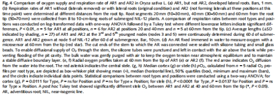 徑向氧分布(Unisense) 圖4e-h AR2根表氧濃度高于AR1,證實其形成氧擴散屏障(減少洪水缺氧損耗)。