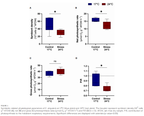 共生型珊瑚的P:R(光合產能/呼吸耗能)在24℃時降至<1,直接量化熱應激導致的能量負平衡。這一指標解釋了脂質儲備下降的原因(圖2A)。