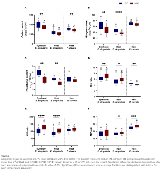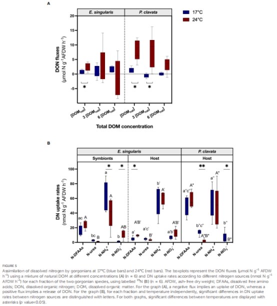 論文通過實驗探究地中海兩種溫帶柳珊瑚(共生型Eunicella singularis和非共生型Paramuricea clavata)在17℃(正常溫度)和24℃(熱應激)下對溶解無機/有機碳(DIC/DOC)和氮(DIN/DON)的吸收能力。主要發現: