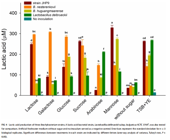 乳酸產量 圖4 JHP9利用甘露糖/蔗糖高產乳酸(>200 μM),具工業發酵潛力。