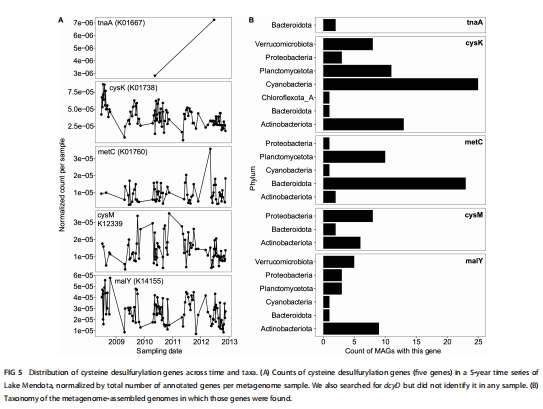 宏基因分布 圖5 證明降解基因在湖泊中廣泛存在(如cysK豐度最高),提示生態(tài)普遍性。