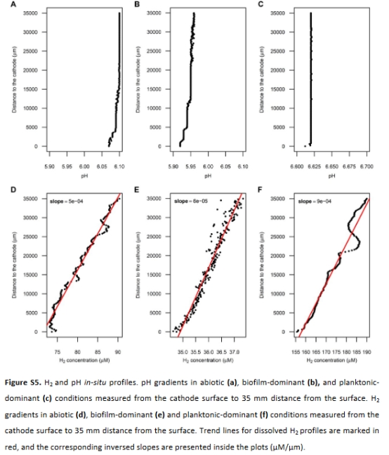 H?濃度梯度 Unisense H?微傳感器(圖S5) 證實陰極附近溶解H?濃度 > 0.6 mM,支持 H?介導的電子傳遞(MET)主導。
