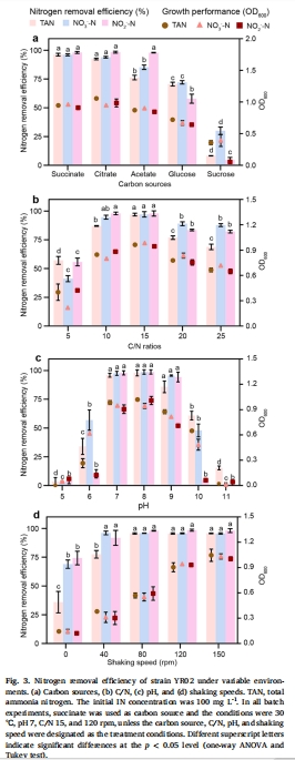 本研究分離出一株新型好氧反硝化菌Pseudomonas sp. YR02,其在好氧條件下具備高效N?O還原能力。關鍵發(fā)現(xiàn):