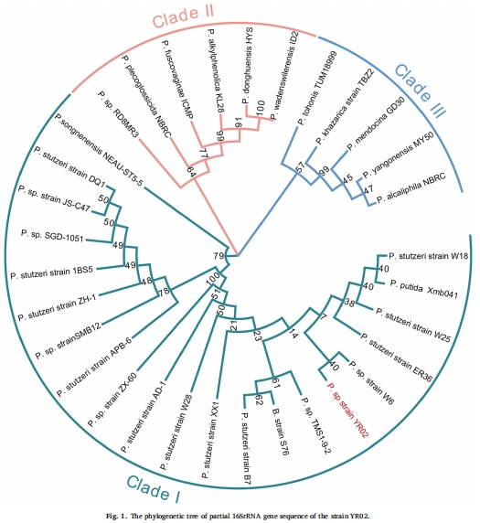 菌株來源:循環(huán)水產(chǎn)養(yǎng)殖系統(tǒng)廢水富集分離(16S rRNA鑒定為Pseudomonas屬,圖1)。