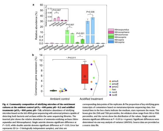 pCO?與pH獨(dú)立效應(yīng)(圖3):高pCO?僅在非酸化條件下促進(jìn)硝化("CO?施肥效應(yīng)"),酸化條件下則加劇抑制作用,表明酸化抵消了CO?對(duì)硝化菌的潛在益處。