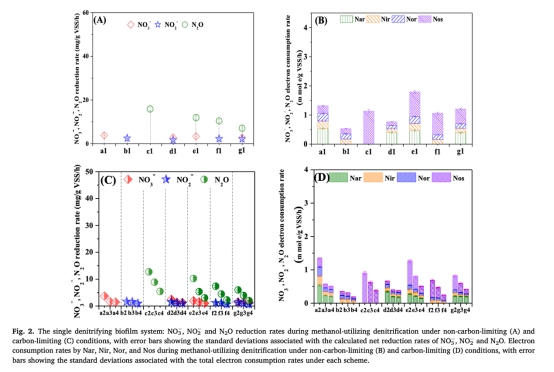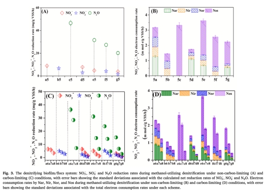 NOx還原速率與電子消耗率:通過線性回歸計算最大還原速率,結(jié)合MLVSS濃度得比還原速率(Eqs 1-8)。來源:圖2(A-D)單一系統(tǒng)、圖3(A-D)絮體系統(tǒng)。意義:量化碳限制下N2O還原率下降(如單一系統(tǒng)碳負荷30 mg-COD/g VSS/h時N2O還原率降至0.14-0.77 mg/g VSS/h),表明電子競爭加劇抑制N2O還原。