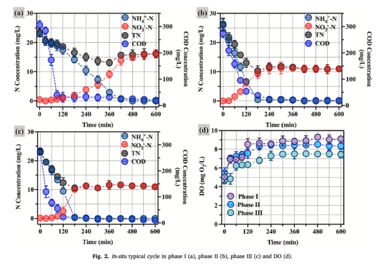 典型周期實驗數據:包括污染物濃度隨時間變化(如NH4-N、TN)和DO動態。來源:圖2a-c和圖2d。研究意義:揭示系統在短時間內的去除動力學(如TN在180分鐘內快速下降),證明SND過程的發生(NO3-N生成量低于NH4-N消耗量),并確認旋轉設計實現穩定DO環境(6-9 mg/L),支持無需外部曝氣的運行模式。