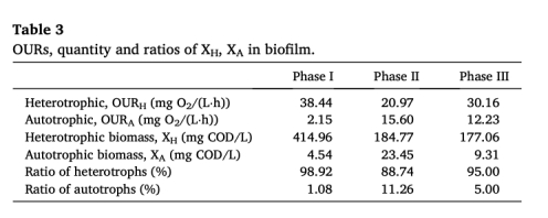 活性生物量數據:包括異養生物量(XH)和自養生物量(XA)比例及氧攝取率(OUR)。來源:表3。研究意義:量化生物膜中功能菌群分布(如XA占比最高11.26%),說明高異養生物主導碳代謝,而自養生物增長支撐硝化性能,反映系統對負荷變化的適應性。