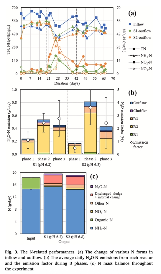 pH調控作用:pH 6.2系統的N?O排放量低于pH 6.8系統(407 vs 475 mg-N/day),表明弱酸性條件可抑制排放