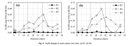 意義:揭示R2為關鍵排放源,其N?O產率(N?OR)與NO?產率(NO?R)量級相當(圖7a),反映不完全硝化與反硝化耦合的高排放風險