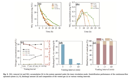 反硝化通量(圖3a, 5c, 6a):H?壓力1.2 atm時,周期性排氣使通量從0.79 g N/m2/d(封閉式)提升至1.18 g N/m2/d。