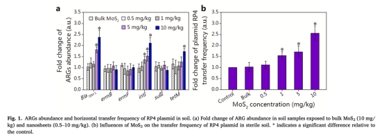 數據:MoS?納米片(10 mg/kg)使blaTEM-1和tetM豐度分別增加2.38倍和1.73倍。