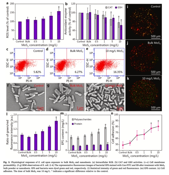 質粒轉移機制:MoS?納米片劑量依賴性地加速RP4質粒在E. coli間的水平轉移頻率(10 mg/L時達對照的2.07倍),而塊體MoS?無此效應(圖1b, 圖2a)。