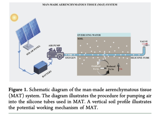 研究提出一種新型人造通氣組織(MAT),通過硅膠管模擬濕地植物根系釋放氧氣,持續提升稻田土壤氧化還原電位(Eh),從而降低砷(As)的生物有效性。MAT使土壤Eh從-119 mV升至-80.7 mV(提升約30%),有效半徑達5 cm,持續作用約100天。其作用機制包括: