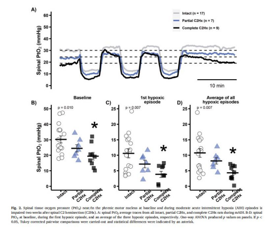 本研究探討中度急性間歇性缺氧(mAIH)對大鼠頸髓半切(C2Hx)后脊髓組織氧合及神經(jīng)可塑性(膈神經(jīng)長時程易化,pLTF;交感神經(jīng)長時程易化,sympLTF)的影響。關鍵發(fā)現(xiàn)包括: