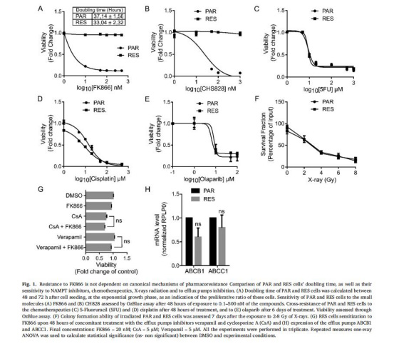 數據:RES細胞對FK866完全耐藥(EC??不可計算),但對化療藥物(5FU、順鉑)敏感;Verapamil/CsA處理不逆轉耐藥;ABCB1/ABCC1表達無差異。