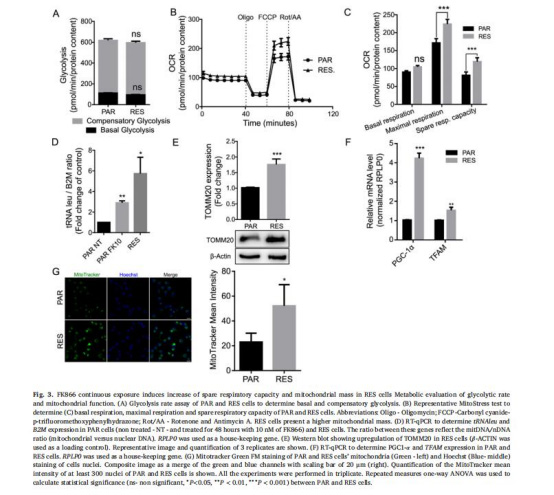 線粒體功能增強:耐藥細胞線粒體備用呼吸能力(SRC)、線粒體質量(mtDNA/nDNA比例增加)及生物合成(PGC-1α/TFAM上調)顯著提升。