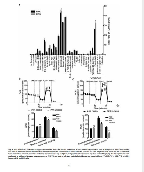 丹麥Unisense微電極數據:RES細胞在丙酮酸剝奪(UK5099)下,琥珀酸氧化耗氧率(OCR) 顯著高于敏感細胞(圖6G)。