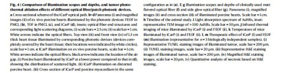 iCarP光照5分鐘,腫瘤中心溫度達56°C,2 mm直徑區域>45°C(圖4k);傳統光纖僅49°C,1 mm區域>45°C。