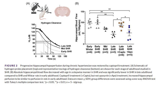 關(guān)鍵機(jī)制:血管緊張素II信號(hào)通路是核心驅(qū)動(dòng)因素——ACE抑制劑卡托普利(captopril)恢復(fù)海馬血流、改善血管功能并挽救記憶,而抗氧化劑阿魏酸(apocynin)無效。