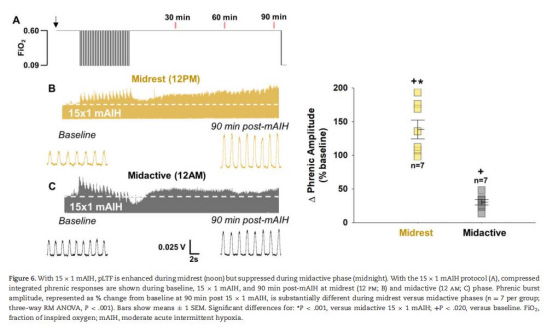 驗證晝夜節律對pLTF的影響:探究休息期(晝間)與活躍期(夜間)對AIH誘導的pLTF幅度及機制的影響。
