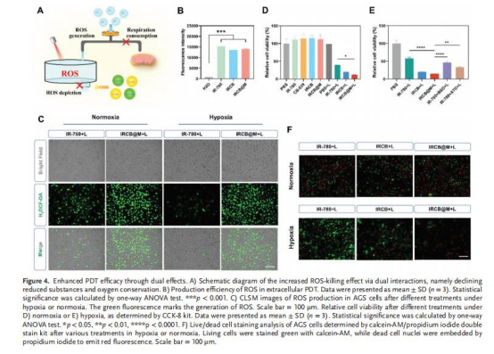 本研究開發了一種新型納米顆粒 IRCB@M,通過雙重機制增強光動力療法(PDT)效果: