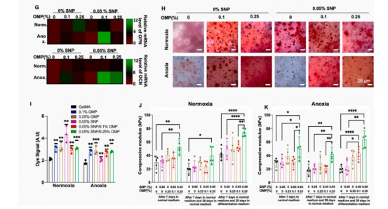 鈣沉積(圖3I):SNP/OMP組在缺氧下鈣沉積量顯著高于SNP組。