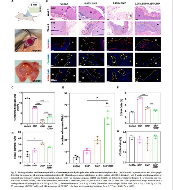 協同效應:OMPs與成骨誘導性硅酸鹽納米顆粒(SNPs)聯用(SNP/OMP水凝膠)在體內促進血管生成和宿主細胞浸潤,加速骨組織再生。