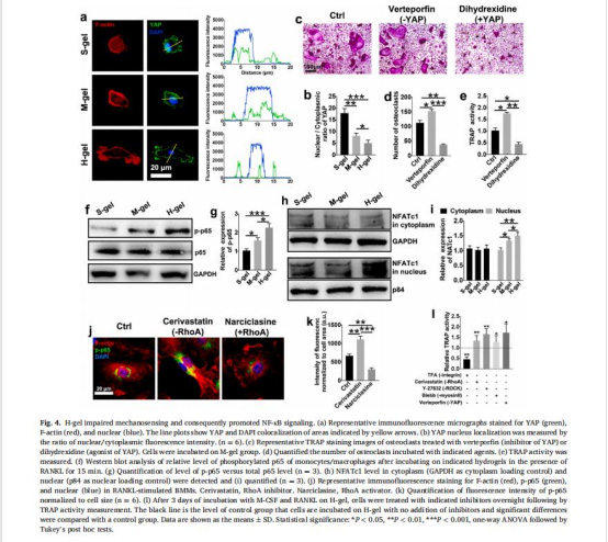 意義:揭示剛度通過整合素負調控RhoA-ROCK2通路,削弱力學傳導,促進NF-κB驅動的破骨細胞分化(圖4f-i)。