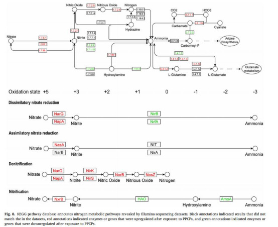 4. 功能機制:PPCPs抑制氨氧化過程(下調氨單加氧酶基因amoA),但上調反硝化功能基因(narG、nosZ),促進氮代謝途徑轉變。