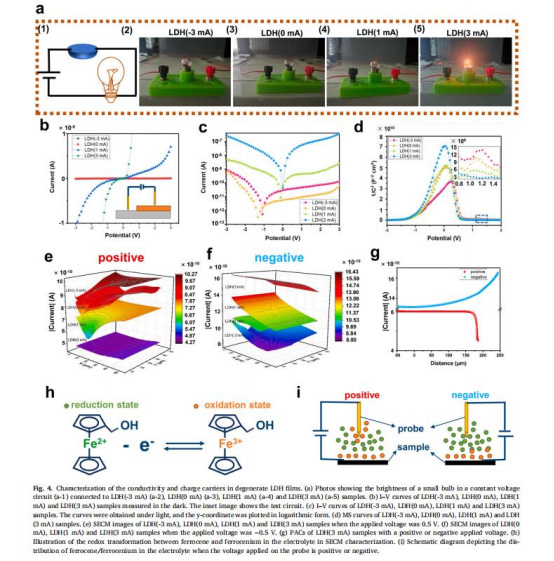 1.電導(dǎo)率數(shù)據(jù)(圖4b):I-V曲線顯示退化薄膜(LDH(3 mA))電導(dǎo)率提升4個(gè)數(shù)量級。意義:證實(shí)退化態(tài)高導(dǎo)電性,為電療提供物理基礎(chǔ)。