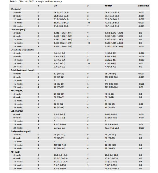 多維度表型分析:體重、血清生化(ALT、AST、血脂)、葡萄糖/胰島素耐受測試、肝臟病理(NAS評分)、脂肪細胞肥大分析。