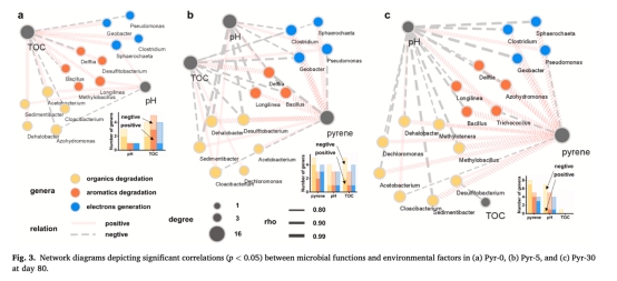 關聯微生物群落結構(PCA、LDA分析)與環境因子(pH、TOC、芘降解效率)的網絡關系(圖3)。