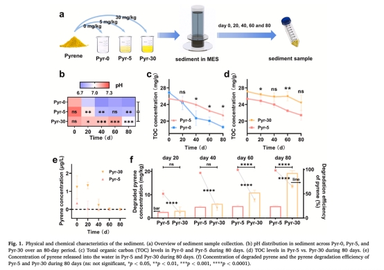 數據:高芘濃度(Pyr-30)下pH下降緩慢(酸化解離減少),TOC降解率降低(圖1c,d),芘降解效率顯著低于Pyr-5(圖1f)。